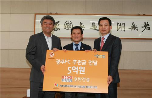 후원금 전달식에는 윤장현 광주광역시장 겸 광주FC 구단주, 김 회장, 정원주 광주FC 대표이사, 정평호 체육U대회지원국장 등이 참석했다.