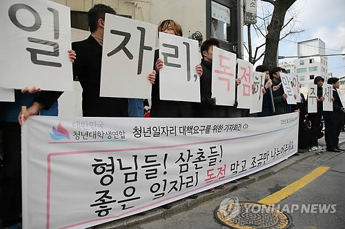 | △ 좋은 일자리 나눠주세요! (서울=연합뉴스) 이정훈 기자 = 대한민국청년대학생연합 관계자들이 26일 오후 서울 중구 정동 민주노총 앞에서 기자회견을 열고 청년실업 대책 강구와 불법파업 중단 등을 민주노총 측에 요구하고 있다. 2015.2.26 uwg806@yna.co.kr |