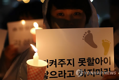 | △ '지켜주지 못할아이 낳으라고 하지마라' (서울=연합뉴스) 박동주 기자 = 아동 성폭력 추방을 위한 시민모임 '발자국'의 한 회원이 4일 오후 서울역 광장에서 열린 아동 성폭행 추방을 위한 집회에서 '지켜주지 못할아이 낳으라고 하지마라' 라고 적힌 손팻말을 들고 있다. 2012.9.4 pdj6635@yna.co.kr |