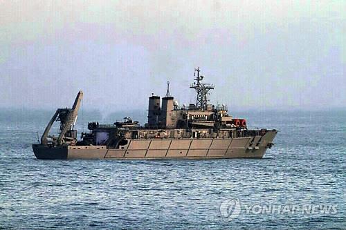 △ 가거도 추락 헬기 인양 준비하는 청해진함 (신안=연합뉴스) 장아름 기자 = 지난 13일 전남 신안군 흑산면 가거도 해상에서 추락한 해경 구급헬기의 동체가 19일 낮 발견됐다. 서해해양경비안전본부는 유실 방지망을 설치하고 동체를 통째로 인양한 뒤 실종자 수색을 할 계획이다. 사진은 이날 오후 7시 50분께 사고 해역에서 인양 준비작업에 투입 중인 청해진함의 모습. (독자제공)