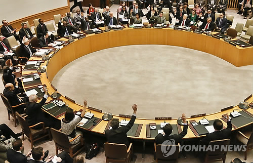 | △ 유엔이 지난 2013년 3월 7일(현지시간) 미국 뉴욕의 유엔본부에서 안전보장이사회(안보리) 전체회의를 열어 북한 핵실험에 대한 제재결의안을 만장일치로 채택하는 모습. 결의안은 핵이나 탄도미사일 개발에 필요하다고 판단되는 물품의 수출입을 금지하는 등 북한의 경제활동에 심각한 타격을 줄 수 있는 내용들 담았다.<<연합뉴스DB>> |
