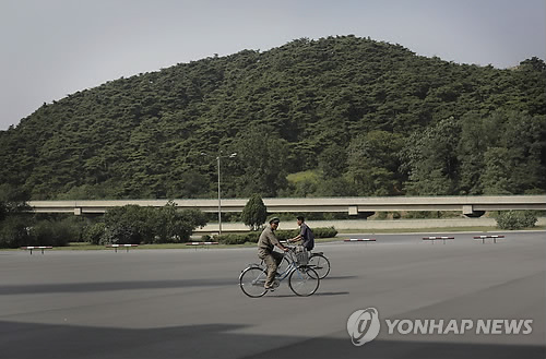 | △ 자전거 타고 출근하는 북한 주민들 (AP=연합뉴스) 2014.9.2 North Korean men cycle as their form of commute, Tuesday, Sept. 2, 2014 in Pyongyang, North Korea. (AP Photo/Wong Maye-E) |