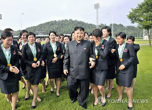 | △ 북한 김정은 국방위원회 제1위원장이 2013년 동아시아연맹(EAFF) 축구선수권대회(동아시안컵)에서 우승한 여자 축구선수들을 만나 격려하는 모습으로 조선중앙통신이 2013년 8월 1일 보도했다. <<연합뉴스DB>> |