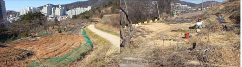 | △ 불법경작 등으로 훼손된 광양 중동(왼쪽)과 밀양 내일동 선정지 |