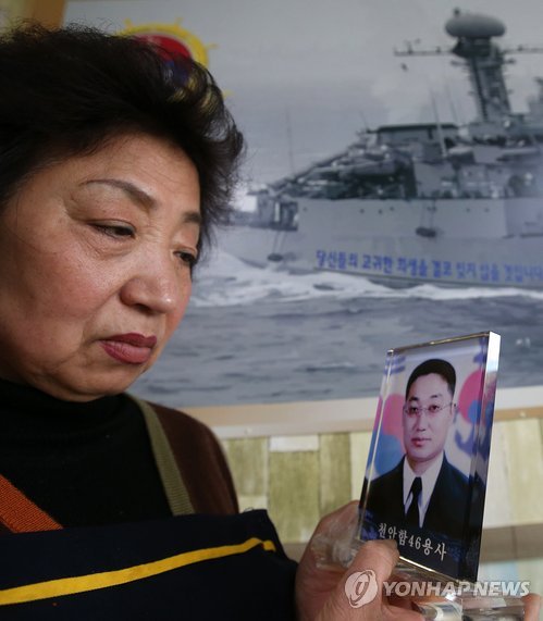 △ 해군 2함대 앞 지키는 천안함 46용사 어머니 (평택=연합뉴스) 신영근 기자 = 천안함 사건 5주년을 사흘 앞둔 23일 오후 경기도 평택 해군 제2함대사령부 앞에서 한식당 '석정'을 운영하고 있는 천안함 46용사 故 문규석 원사의 어머니 유의자(64)씨가 천안함 사진 앞에서 아들의 얼굴을 바라보고 있다. 2015.3.23 drops@yna.co.kr http://blog.yonhapnews.co.kr/geenang
