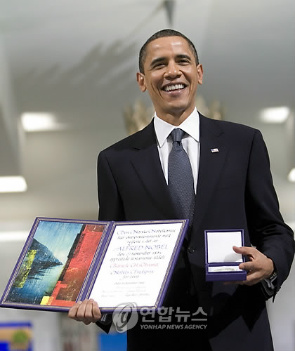 △ 버락 오바마 미국 대통령이 지난 2009년 12월 10일 노르웨이 오슬로 시청에서 열린 노벨 평화상 수상식에서 토르비에르 야글란 노벨 위원회 위원장으로부터 상을 받고 기뻐하는 모습.<<연합뉴스DB>>