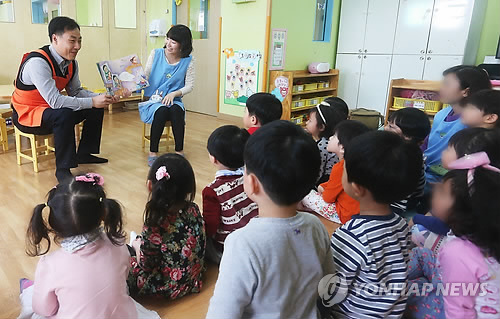 | △ '어린이집 보조 교사 체험' (서울=연합뉴스) 홍기원 기자 = 지난 20일 서울 성북구 장위동의 한 국공립어린이집에서 현영남 보건복지부 사무관이 보조 교사 체험을 하고 있다. 2015.3.23 xanadu@yna.co.kr |