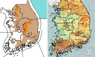 | △ 붉게 물든 '산불위험지수 지도' (대전=연합뉴스) 정윤덕 기자 = 전국 대부분 지역에 건조특보(왼쪽)가 내려진 가운데 산림청이 운영하는 국가산불위험예보시스템상 산불위험지수 지도(오른쪽)도 23일 오후 4시 30분 현재 온통 붉게 물들어 있다. |