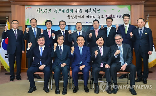 | △ 경북도 독도위원회 출범 (대구=연합뉴스) 24일 경북도청 회의실에서 독도 정책의 브레인 역할을 하는 독도위원회 위원들이 출범식 뒤 기념촬영을 하고 있다. 2015.3.24 haru@yna.co.kr |