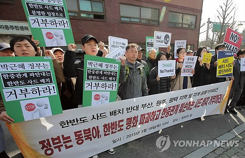 △ 사드 한반도 배치 반대 기자회견 (서울=연합뉴스) 이정훈 기자 = 전쟁반대평화실현국민행동과 사드 배치 후보지로 거론되는 평택·부산·원주 시민·사회단체 관계자들이 19일 서울 종로구 청운효자동주민센터 앞에서 미국의 고고도미사일방어체계인 사드(THAAD)의 한반도 배치를 반대하는 기자회견을 하고 있다. 2015.3.19 uwg806@yna.co.kr
