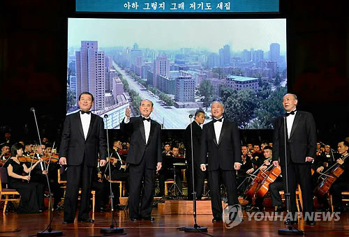 | △ 북한 평양인민극장에서 2월 21일부터 3월 22일까지 진행된 '추억의 노래' 공연에서 유명가수 주창혁을 리더로 한 남성4중창조가 공연을 하고 있다.2015.3.24.<<연합뉴스DB>> |