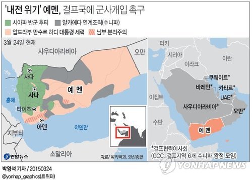 (두바이=연합뉴스) 강훈상 특파원 = 시아파 반군 후티의 쿠데타와 유혈 충돌로 내전 위기에 처한 예멘이 걸프지역 아랍국가들에 군사 개입을 촉구했다.