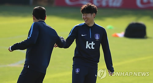 △ 밝은 표정의 손흥민 (파주=연합뉴스) 김도훈 기자 = 우즈베키스탄과의 평가전을 사흘 앞둔 24일 오후 경기도 파주 국가대표트레이닝센터(NFC)에서 실시된 소집훈련에서 손흥민이 동료와 밝게 웃으며 이야기하고 있다. 2015.3.24 superdoo82@yna.co.kr