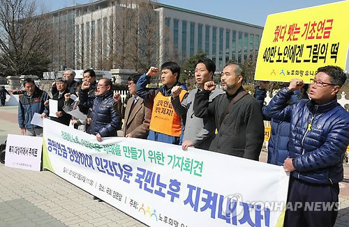 (서울=연합뉴스) 이대희 기자 = 60대 이상 노년층으로 구성된 노후희망유니온은 24일 서울 여의도 국회 앞에서 기자회견을 열어 "노후 빈곤 해결을 위해 공무원연금 개악을 중단하고 공적연금을 강화하라"고 주장했다.
