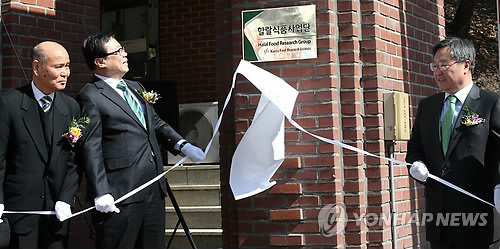 | △ 지난 12일 오전 이동필 농림축산식품부 장관(왼쪽에서 2번째)이 참석한 가운데 경기도 성남시 분당구 한국식품연구원에서 할랄식품을 수출 주력상품으로 키우기 위한 할랄식품사업단 출범 현판식이 열리고 있다. |