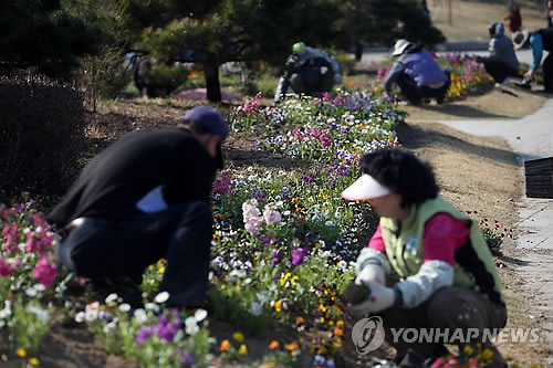| △ 향기나는 한강공원 조성위해 (서울=연합뉴스) 박동주 기자 = 25일 서울 여의도 한강공원에서 자원봉사자 등이 꽃을 심고 있다. 서울시 측은 사계절 꽃이 만발하고 향기나는 한강공원을 조성하기 위해 이날부터 '한강 백리 꽃길' 조성사업을 시작한다고 밝혔다. |