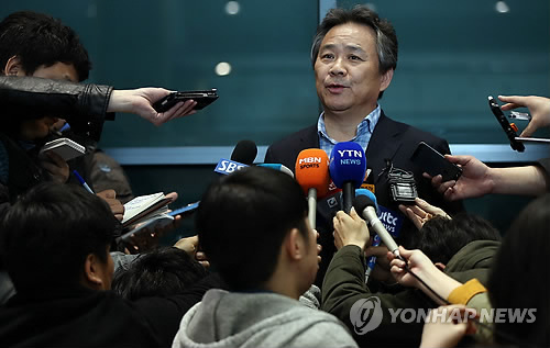 △ 질문 답하는 이기흥 수영연맹 회장 (영종도=연합뉴스) 이지은 기자 = 이기흥 대한수영연맹 회장이 국제수영연맹(FINA) 도핑위원회 청문회를 마치고 26일 오전 인천공항을 통해 귀국한 후 취재진 질문에 답하고 있다. 이 회장과 수영연맹 관계자들은 금지약물 검사에서 양성반응이 나타난 박태환을 돕기 위해 함께 청문회에 참석했다. 박태환은 국제수영연맹으로부터 18개월 선수 자격정지 징계를 받았다.
