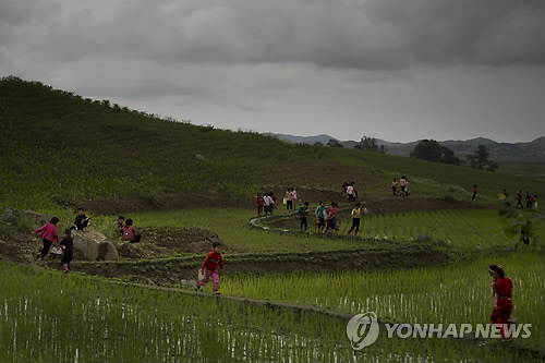 | △ 북한 평양 교외 농촌 풍경 (AP=연합뉴스) 2014.6.21 In this Saturday, June 21, 2014 photo, North Korean schoolchildren work together in a rice paddy southeast of Pyongyang, North Korea. For more than four decades, farming in the North was characterized by heavy use of mechanization swiftly followed by chronic fuel and equipment shortages and stopgap policies. (AP Photo/David Guttenfelder) |