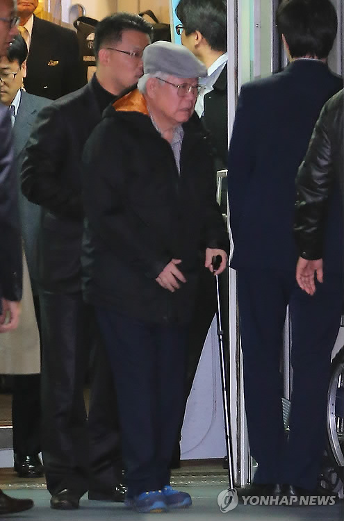 | △ 김필배 전 문진미디어 대표가 지난해 11월 25일 오후 미국 호놀룰루발 대한항공기를 이용해 인천공항에 도착한 뒤 검찰 수사관에 의해 인천지검으로 압송되고 있다. (연합뉴스 자료사진) |