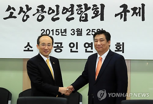 | △ 국무조정실-소상공인연합회 규제 개혁 간담회 (서울=연합뉴스) 홍해인 기자 = 추경호 국무조정실장(왼쪽)이 25일 오후 서울 여의도 소상공인연합회에서 열린 규제개혁 간담회에 참석해 최승재 소상공인연합회장과 악수하고 있다. 2015.3.25 hihong@yna.co.kr |