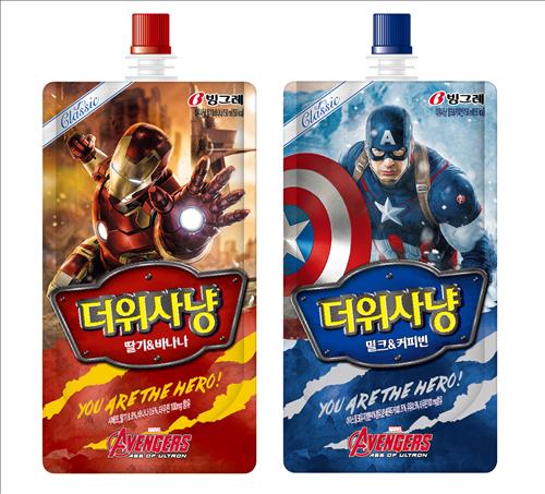 '밀크&커피빈'은 캡틴아메리카, '딸기&바나나'는 아이언맨을 패키지에 그려 넣어 제품에 캐릭터 이미지를 줬다.