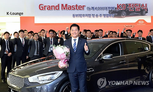 | △ '4천대 판매' 기아차 정송주 부장 그랜드마스터 등극 (서울=연합뉴스) 기아자동차의 정송주 영업부장(망우지점)이 누적 판매 4천대를 달성해 회사 역사상 5번째 '그랜드마스터'에 올랐다. 기아차는 지난 24일 서울 압구정동 기아차 사옥에서 정 부장에게 그랜드마스터 호칭을 부여하고 부상으로 기아차의 최고급 대형 세단 K9을 제공했다고 26일 밝혔다. (기아차 제공) |