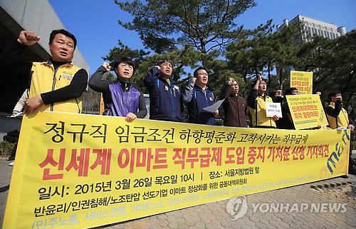 | △ 이마트 직무급제 도입 중지 가처분 신청 회견 (서울=연합뉴스) 홍해인 기자 = 이마트노조, 민주노총, 서비스연맹, 민변 등 노동·사회단체 회원들이 26일 오전 서울 서초동 법원삼거리에서 법원에 신세계 이마트의 직무급제 도입 중지 가처분 신청을 내기에 앞서 기자회견을 하며 구호를 외치고 있다. 2015.3.26 hihong@yna.co.kr |