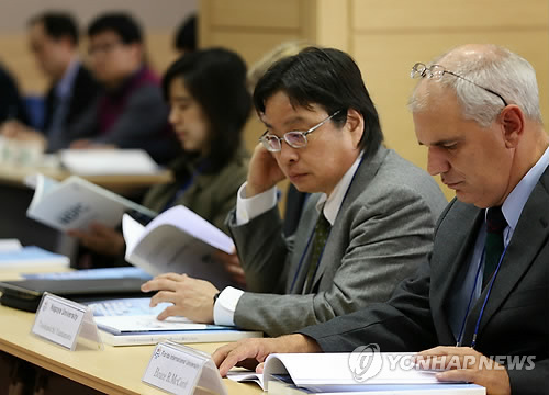 | △ 대검, DNA 학술대회 개최 (서울=연합뉴스) 이지은 기자 = 26일 오후 서울 서초구 국가디지털포렌식센터에서 열린 '제3회 법과학 DNA 국제 심포지엄'에서 미국 플로리다 국제대학교 브루스 맥코드 교수(앞줄 오른쪽부터), 일본 나고야대학교 도시미치 야마모토 교수 등 국내외 전문가들이 자료집을 살펴보고 있다. 검찰은 DNA 감식 등을 통한 수사를 한 단계 발전시키기 위해 학계와 학술대회를 열고 최신 연구동향을 공유했다. 2015.3.26 jieunlee@yna.co.kr |