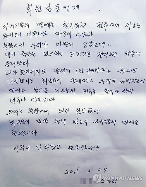당시 공개된 문서에는 "내가 혼자서라도 끝까지 1인 시위하다가 죽으면 내 시체라도 회원들이 둘러메고 우리 아버지들의 명예와 돌아온 자식들의 권리를 찾아야 한다", "너무 억울하다. 안타깝고 분통하다" 등의 내용이 적혀 있었다.