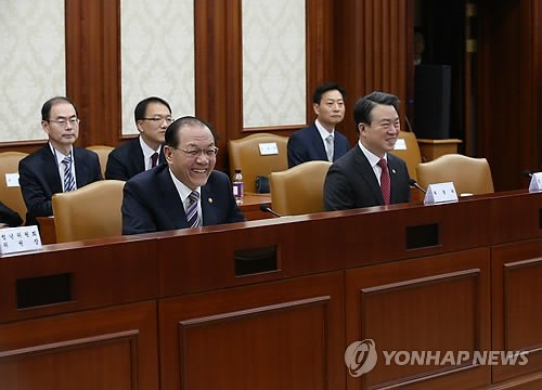 | △ 사회관계장관회의 (서울=연합뉴스) 전수영 기자 = 황우여 사회부총리 겸 교육부 장관이 27일 오전 서울 세종로 정부서울청사에서 열린 사회관계장관회의 시작전 참석자들과 환담하고 있다. |