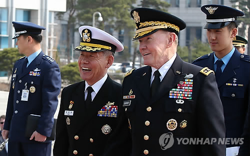 (서울=연합뉴스) 김호준 기자 = 최윤희 합참의장과 마틴 뎀프시 미국 합참의장은 27일 서울에서 회담을 갖고 북한의 핵·미사일 위협에 대비한 '통합 대공·미사일 방어체계'(IAMD) 관련 논의를 한 것으로 알려졌다.