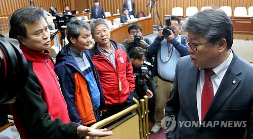△ 조원진 공동위원장과 공무원노조 간부 (서울=연합뉴스) 백승렬 기자 = 공무원연금개혁 국민대타협기구 공동위원장인 새누리당 조원진 의원이 27일 국회에서 열린 공무원연금개혁을 위한 국민대타협기구 마지막 전체회의에서 정회를 선언하고 밖으로 나가며 공무원노조 간부 앞을 지나고 있다.