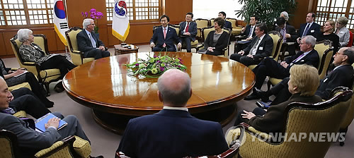 | △ 윤병세 장관, 시카고국제문제협의회 대표단과 환담 (서울=연합뉴스) 황광모 기자 = 윤병세 외교부 장관이 27일 오전 서울 도렴동 외교부에서 방한중인 미국 시카고국제문제협의회 대표단과 만나 환담하고 있다. |