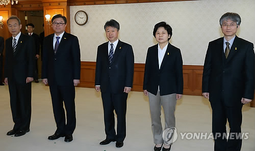 | △ 지난 5일 오후 서울 세종로 정부서울청사에서 열린 임명장 수여식에 참석한 '4·16 세월호 참사 특별조사위원회' 상임위원들. 왼쪽부터 이석태(위원장)·조대환(부위원장)·권영빈·김선혜·박종운 위원. |