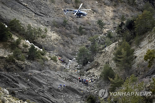 | △ A helicopter flies overhead as rescue workers work at the crash site of Germanwings passenger plane near Seyne-les-Alpes, France, Thursday, March 26, 2015. This week's air crash of a German airliner into a rugged mountainside was a deliberate act of the co-pilot, according to reports from James Hall, a former chairman of the National Transportation Safety Board. (AP Photo/Laurent Cipriani) |