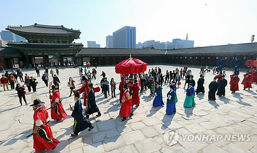 | △ 왕과 함께하는 고궁 나들이 (서울=연합뉴스) 최재구 기자 = 25일 서울 경복궁에서 열린 왕과 왕비의 궁궐산책을 재현한 행사 '왕가의 산책'에서 조선시대 왕과 왕비 등으로 분장한 연기자들이 경복궁 경내를 거닐고 있다 2015.3.25 jjaeck9@yna.co.kr |