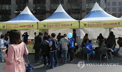 | △ 통일유니워크 (서울=연합뉴스) 한종찬 기자 = 29일 오후 서울 청계광장에서 북한인권학생연대 주최로 열린 '통일유니워크'에서 시민들이 행사 부스를 둘러보고 있다. 이날 행사에서 모인 적립금은 탈북 청소년 대안학교인 '겨레얼학교' 등에 전달된다. 2015.3.29 saba@yna.co.kr |