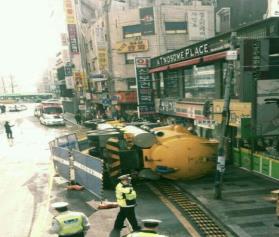 이날 오후 2시 20분께 서울 서대문구 현대백화점 신촌점 주차장 인근 이면도로가 내려앉는 바람에 그 위를 지나던 15t 무게의 하수도 준설 차량이 옆으로 넘어져 인도를 완전히 덮쳤다.