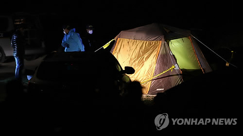 | △ (제주=연합뉴스) 변지철 기자 = 30일 오후 10시 43분께 제주시 한림읍 협재해변 야영장에 설치된 텐트 안에서 남성 4명이 숨진 채 발견된 가운데 경찰이 수사를 벌이고 있다. 2015.3.31 bjc@yna.co.kr |