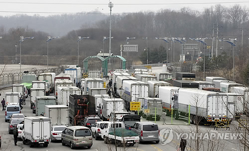 | △ 출경 기다리는 차량행렬 (파주=연합뉴스) 윤동진 기자 = 북한이 개성공단 북측 근로자의 임금인상을 일방적으로 통보하면서 남북간 긴장감이 조성되는 가운데 18일 오전 경기 파주시 경의선 남북출입사무소에서 차량들이 출경을 기다리고 있다. 2015.3.18 mon@yna.co.kr |