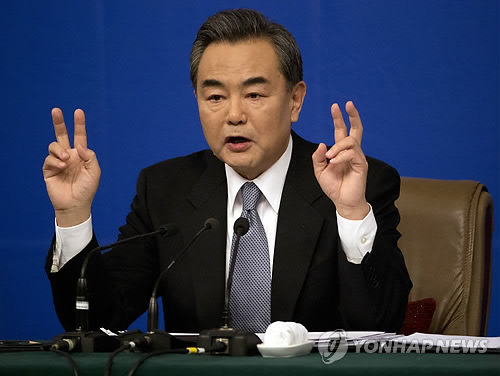 △ 中외교부장, 북중 정상회담 가능성 시사 (AP=연합뉴스) 왕이 중국 외교부장은 8일(현지시간) 베이징 미디어센터에서 가진 내외신 기자회견에서 "중북 관계는 기초가 매우 튼튼하기 때문에 특정 시기와 개별적인 일에 영향을 받아서도 안 되며 받을 수도 없다"면서 북한과 중국의 정상회담 문제와 관련해 "양측의 편리한 시기가 언제인지 봐야 한다"고 말했다. 이는 김정은 북한 국방위원회 제1위원장의 러시아 방문과 관계없이 시진핑 중국 국가주석과 김 제1위원장의 만남이 적절한 시기에 추진될 수 있음을 시사한 것으로 풀이된다. 사진은 이날 왕이 외교부장이 내외신 기자회견을 하고 있는 모습. marshal@yna.co.kr China's Foreign Minister Wang Yi gestures while speaking at a press conference in Beijing, Sunday, March 8, 2015. Wang renewed calls for Japanese leaders to abandon any attempt to water down the nation’s guilt over its World War II aggression against China and others. Wang said that history continues to haunt relations between Beijing and Tokyo. He said Japanese leaders should drop their historical baggage and make a clean break with Japan’s militaristic past. (AP Photo/Mark Schiefelbein)