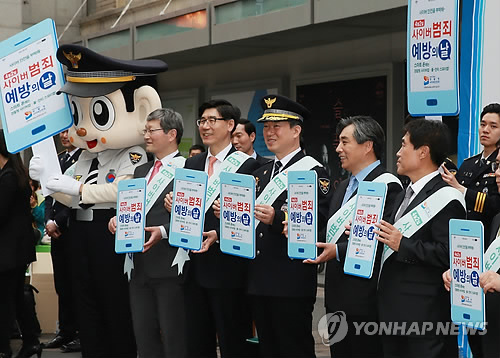 이날 오후 중구 명동거리에서 진행된 '사이버범죄 예방의 날' 행사에서 강신명 경찰청장, 백기승 인터넷진흥원장 등 유관기관의 기관장과 사이버 명예경찰 회원들이 시민에게 '사이버범죄 예방 수칙' 리플릿과 예방 스티커를 나눠줬다.