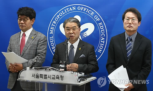| △ 서울, 경기, 인천 교육감, "정부 누리과정 방침 유감" (서울=연합뉴스) 신준희 기자 = 조희연 서울시교육감(오른쪽부터)과 이재정 경기도교육감, 이청연 인천시교육감이 2일 오후 종로구 서울시교육청에서 누리과정 예산문제 관련 공동 기자회견을 하고 있다. |