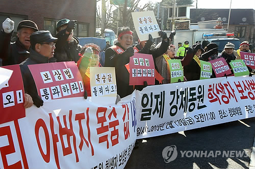 | △ 일제 강제동원 희생자 보상 촉구 (서울=연합뉴스) 김주성 기자 = 일제 강제동원희생자 유가족들이 13일 오전 서울 종로구 청운효자동주민센터 앞에서 기자회견을 열어 국회에 계류 중인 일제 강제동원 희생자 보상법 통과를 요구하고 있다. 2015.2.13<<연합뉴스 DB>> utzza@yna.co.kr |
