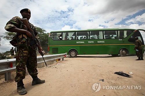 | △ 이슬람 극단주의 무장세력 알샤바브의 공격에서 살아남은 가리사 대학 학생들이 4일(현지시간) 케냐군 병사가 경비하는 가운데 버스를 타고 집으로 떠나고 있다. (EPA=연합뉴스 자료사진) |