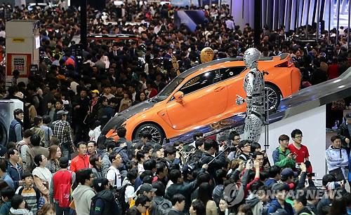| △ (고양=연합뉴스) 최재구 기자 = 5일 고양시 킨텍스에서 계속된 서울모터쇼에 주말을 맞아 구름인파가 몰려 전시된 차량을 살펴보고 있다. jjaeck9@yna.co.kr |