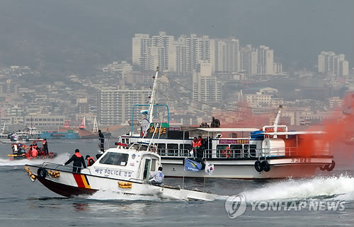 | △ 지난 3월 경남 창원시 마산합포구 마산만내 돝섬 해상에서 남해해양경비안전본부 주관으로 유람선이 돝섬 인근 해상에서 암초와 충돌해 침몰하는 상황을 가정해 '2015 해양안전 종합훈련'이 실시됐다.(연합뉴스 자료사진) |