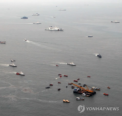 △ <세월호 참사 1년> 하늘에서 바라본 사고해역의 모습 (서울=연합뉴스) 세월호 참사가 발생한 지 16일로 1년이 된다. 상당수 국민은 충격과 슬픔에서 벗어나 일상으로 돌아갔지만 유족과 실종자 가족의 상처는 여전하다. 연합뉴스는 세월호 참사 1년을 뒤돌아 보고 그동안의 진상규명과 과정과 한국 사회의 안전 변화상, 개선방향을 점검한다. 사진은 2014년 4월 22일 헬리캠으로 촬영한 사고 해역의 구조작업의 모습. 2015.4.6 << 연합뉴스DB >> photo@yna.co.kr