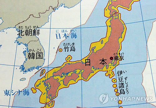| △ 독도를 일본 땅으로 표기한 일본 중학교 교과서 (도쿄=연합뉴스) 이세원 특파원 = 6일 일본 문부과학성의 검정을 통과한 중학교 교과서의 지도에 독도가 다케시마(竹島·일본이 주장하는 독도의 명칭)로 표기돼 있고 일본 땅으로 구분돼 있다. 이 교과서는 내년도부터 사용된다. |