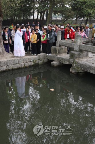 △ 개성 관광객 10만명 돌파 (개성=연합뉴스) 박지호 기자 = 개성관광객 10만명을 넘어선 15일 오후 황해남도 개성시 선죽교를 찾은 관광객들이 안내원의 설명을 듣고 있다. jihopark@yna.co.kr